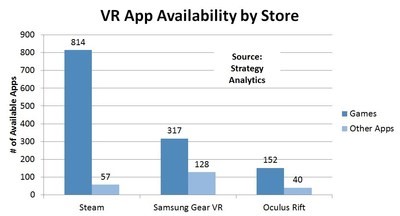 Strategy Analytics 追蹤了三星 GearVR 和 Oculus Rift 的 VR 專屬應用商店上推出的應用以及 Steam 上的 VR 應用。不出所料,游戲類應用在所有商店中占比最高。教育內容在非游戲類別所占比例最高,并且躋身所有商店前三大內容類別之一。Steam 以871款 VR 應用擁有最高的開發者支持,而 Oculus Rift 商店擁有最少應用,僅192款。(美通社,2016年12月13日波士頓)