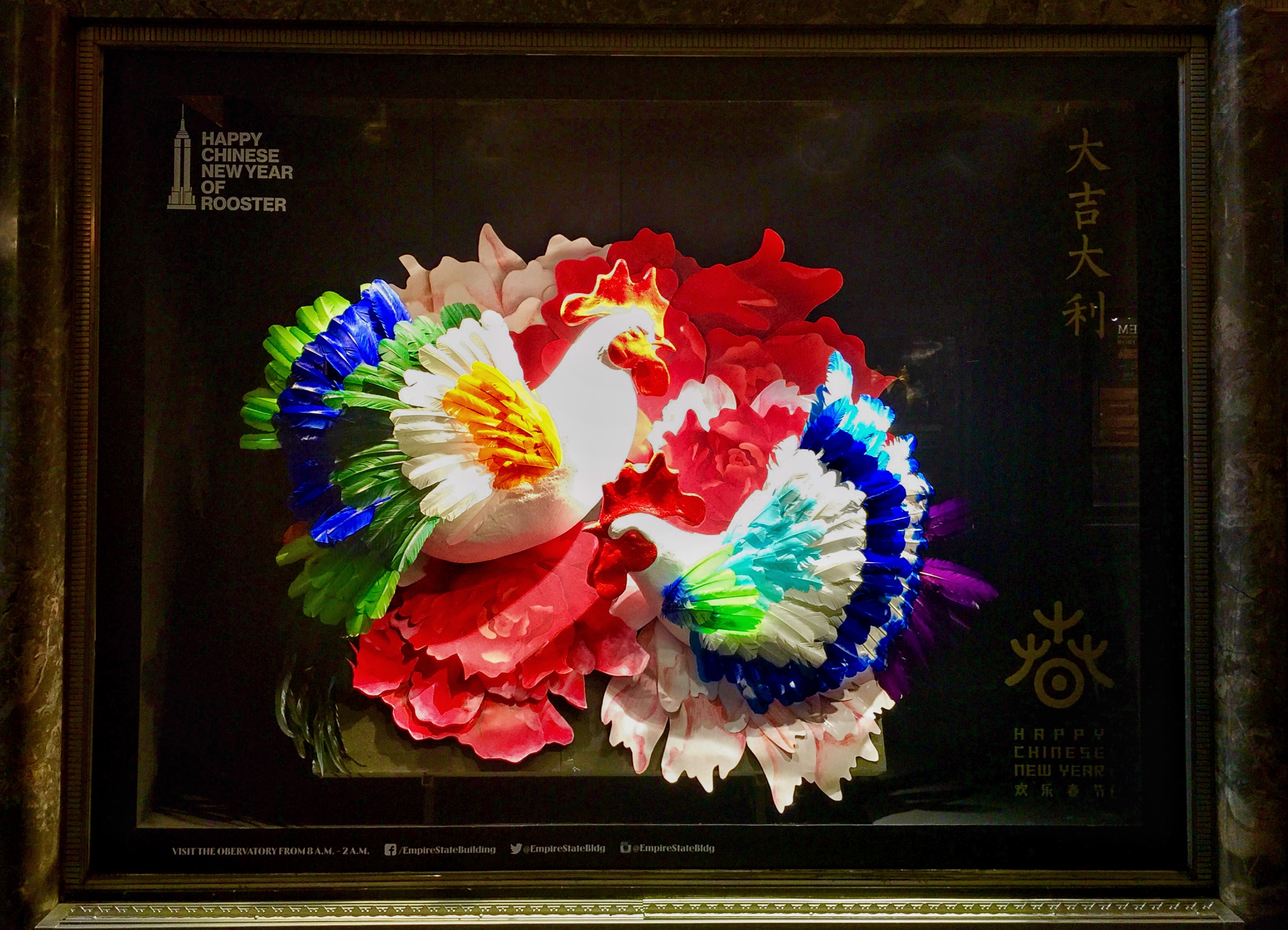 為慶祝雞年春節(jié)的到來,帝國(guó)大廈將專為中國(guó)農(nóng)歷新年亮燈并進(jìn)行新年倒數(shù),并推出一年一度的春節(jié)櫥窗展,分別以“金雞報(bào)曉”、“大吉大利”、“金雞納福”為主題,為觀眾呈獻(xiàn)融合當(dāng)代特色的立體中國(guó)年畫。2017年1月26日至27日,專為中國(guó)農(nóng)歷新年打造,由中央美術(shù)學(xué)院設(shè)計(jì)的“普天同慶”新春燈光秀將于帝國(guó)大廈舉世聞名的塔頂特別呈現(xiàn)。(美通社,2017年1月24日紐約)