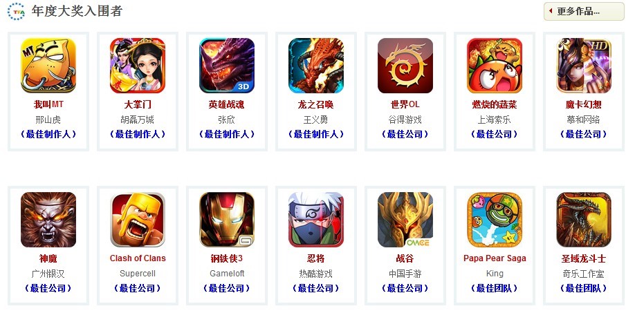 從9月1日啟動報名以來到10月20日天府獎截止報名為止,組委會已先后收到CMGE中國手游的《戰谷》、樂動卓越《我叫MT》、玩蟹科技《大掌門》、掌上明珠的《圣域龍斗士》、墨麟《秦美人》、索樂的《燃燒的蔬菜》、熱酷的《忍將》、Gameloft的《鋼鐵俠3》、DeNA夢寶谷的《變形金剛》、銀漢的《神魔》、supercell的《Clansh of Clans》以及7K7K《瘋狂的方言》等共計184款游戲角逐本次天府獎的報名申請。