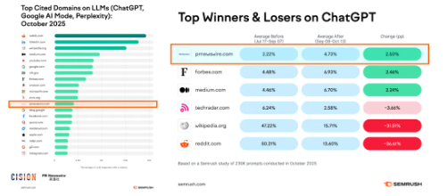 再來看一個調查數據:下圖是Semrush在去年10月份,基于23萬條真實的AI提問做的一項研究。他們統計了ChatGPT、Google Gemini最常引用的網站來源。而美通社的官網PRNewswire.com的排名在第14位,超過大量的我們傳統認知中的知名網站與內容平臺。