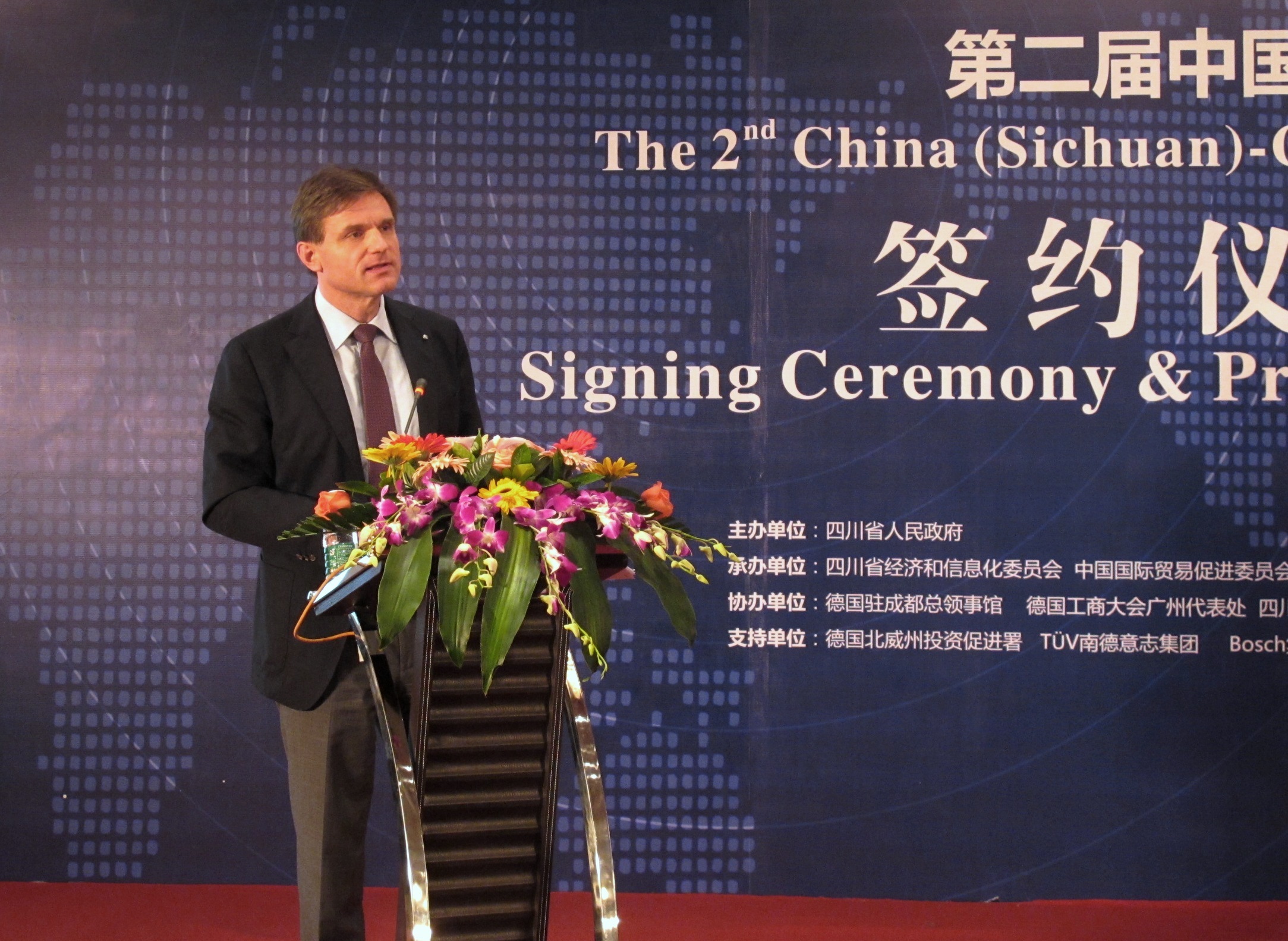四川憑借其豐富的資源、重要的戰略地位以及巨大的市場潛力,已經逐步成為西部經濟跨越式發展的引擎。同時,四川是傳統的重工業制造基地,擁有良好的工業基礎和技術累計。在學術方面,更是擁有眾多科研院所和高等學府,每年培養了大量技術人才支持西部的發展。TUV SUD 大中華集團總裁 & CEO 范華德(Dirk von Wahl)先生在發言中表示:“通過近距離的交流切磋,一方面使中德企業間增進了了解,為以后的合作創造更多條件;另一方面,TUV SUD 很樂意把集團在德國及歐洲相關領域的一些經驗引進到這個區域,作為西部地區企業拉近與國際市場的紐帶與橋梁。”