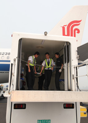 上午7時50分,運送災區重傷群眾的救護車在警車引領下,駛入成都雙流國際機場。救護車剛一停穩,國航西南分公司地面服務人員在救護員的協助下,從車上小心翼翼地抬起擔架,把傷員轉移到飛機下的殘疾旅客升降平臺車。隨著這臺緊急購置的專用平臺車反復緩緩升降,僅有一個小時,傷員被依次安全地送進客艙,36名傷員家屬和15名醫護人員也隨機飛往廣州。當日下午,這架改裝波音757飛機又往返廣州運送了第二批災區傷員。該機將被安排在成都雙流機場駐扎,隨時準備執行航班,搶運傷員到北京、上海、廣州等地接受醫治。