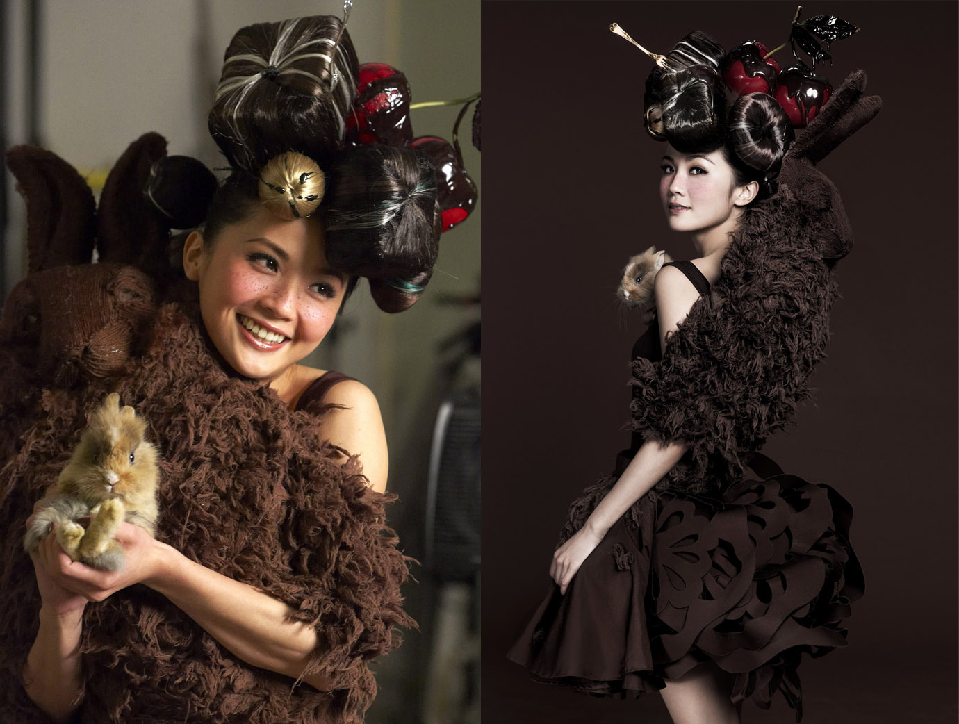 拍攝過(guò)程中,同一條裙子換了3個(gè)不同造型,由早上11時(shí)拍到晚上8時(shí)。今次在頭飾方面,更邀得曾為L(zhǎng)ady Gaga及Rihanna等天后級(jí)歌手制作無(wú)數(shù)驚艷頭飾及帽子的設(shè)計(jì)師 Piers Atkinson制作車(chē)?yán)遄宇^飾。阿Sa需要戴上重4磅的頭套,以假發(fā)繞成朱古力的模樣,并在車(chē)?yán)遄硬迳弦桓卮蟮牟妫浜险褂[主題。除此之外,化妝方面亦要灑上大量朱古力粉,滲進(jìn)了阿Sa的眼睛內(nèi),更令她不斷打噴嚏,但為求不阻礙進(jìn)度,她堅(jiān)持撐大眼睛繼續(xù)拍攝,專(zhuān)業(yè)程度可見(jiàn)一斑!