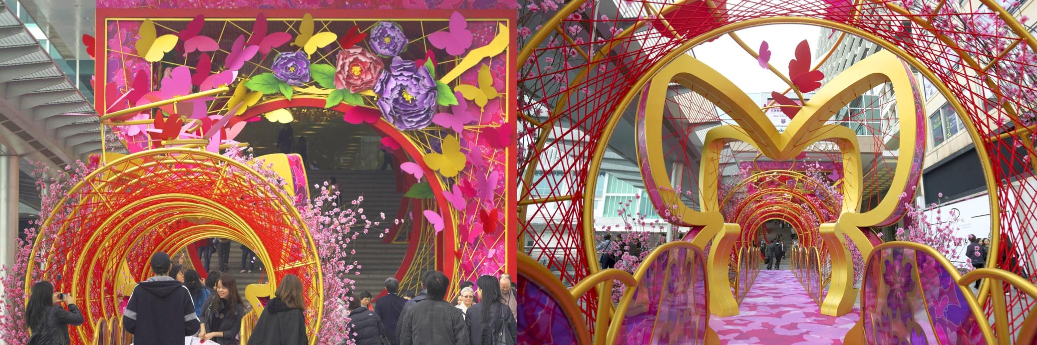 海港城海運(yùn)大廈正門(mén)設(shè)置以金色及桃紅色為主色,桃紅色的柱身及長(zhǎng)廊布滿了三千多只金色喜蝶,在巨型牡丹花叢襯托下翩翩起舞。而正門(mén)天花更掛上了3 組由許多只蝴蝶組成的12尺闊巨型喜蝶,俏麗的喜蝶在花叢中欣然起舞,春意盎然般躍現(xiàn)活潑朝氣,寓意“花開(kāi)富貴”、“喜蝶迎春”,跟大家一起迎接新春佳節(jié)。