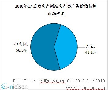 另據CR-Nielsen(尼爾森)報告顯示,房產類網絡展示廣告價值估算中房產網站市場集中度較高,房產廣告投放TOP3以2.58億元的廣告價值估算占行業整體市場69.3%的份額。其中搜房網廣告價值估算高達2.19億元,是第二名的6倍。搜狐焦點網的廣告價值估算在第四季度超過新浪房產。