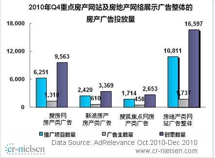整體來看,房產廣告推廣項目數、廣告主總量、廣告創意數與去年同期相比都有大幅增長,其中房產廣告推廣項目數與去年同期相比增長113.4%,較為迅速。同時報告分析指出,房地產網絡展示廣告投放TOP3網站分別為搜房網、新浪房產、搜狐焦點網。報告顯示,2010年第四季度中國互聯網房地產行業展示類廣告推廣項目總量為10811個,其中搜房網是第二名2.5倍、第三名的3.5倍;2010年第四季度中國互聯網房地產行業展示類廣告廣告主總量為1734,搜房網以75.9%的份額大幅領先;2010年第四季度中國互聯網房地產行業展示類廣告創意總量為16597,搜房網以9563領先第二名和第三名3-4倍的優勢雄踞榜首。