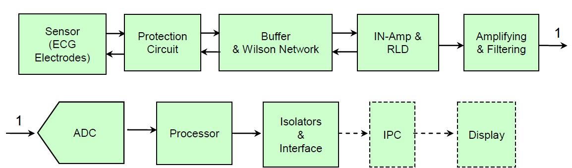 圖1是 ECG 設計的一個單導聯 ECG 系統簡化系統功能框圖。如果采用分立器件實現 ECG 設計,在模擬前端部分,每個導聯都需要實現圖中保護電路、緩沖、放大及濾波、ADC 等功能電路模塊。工程師獨立完成該系統設計將是一個極具挑戰性的工作:首先,分立器件的選擇需要參考眾多的性能指標,包括濾采樣速率、帶寬、噪聲,等等;為使 ECG 測量輸出信息可用,必須保證通道之間的一致性;前端信號調理電路與 ADC 之間的匹配;眾多的調試點,調試工作量巨大……事實上,除了圖中所示的基本功能模塊外,用戶的設計工作可能還包括:構建 RFI 濾波器以減少諸如手機、廣播等的無線干擾;選擇合適的阻容器件設定恰當的濾波頻率;對敏感器件增加靜電屏蔽罩以避免 ESD 干擾,使產品滿足 IEC 相關標準要求。