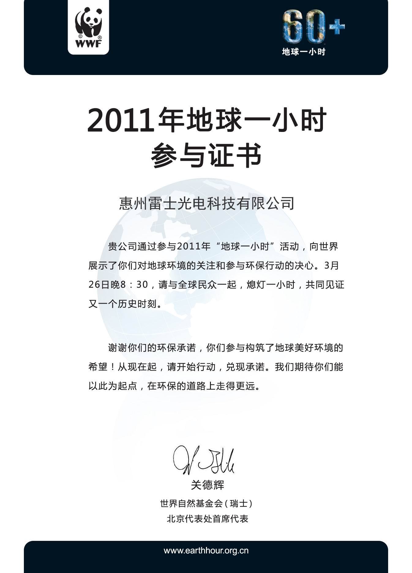 惠州2011年3月29日電 /美通社亞洲/ -- 為響應(yīng) WWF(世界自然基金會(huì))發(fā)起的倡議,3月26日晚上20:30至21:30,中國(guó)較大節(jié)能照明品牌企業(yè)雷士照明積極參與“地球熄燈一小時(shí)”活動(dòng),在雷士工業(yè)園開(kāi)展了宿舍大樓、辦公樓等廠區(qū)熄燈一小時(shí)、員工齊作環(huán)保承諾等一系列節(jié)能環(huán)保活動(dòng),以實(shí)際行動(dòng)踐行企業(yè)的節(jié)能環(huán)保責(zé)任。
