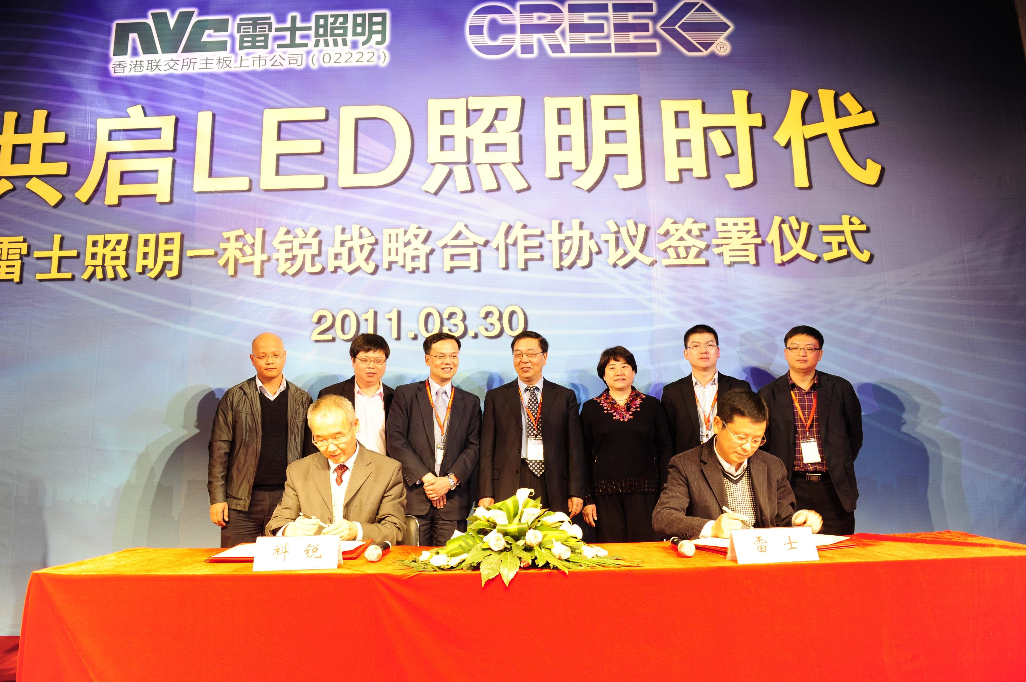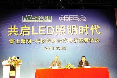 中國惠州2011年3月31日電 /美通社亞洲/ -- 國際知名專業(yè)照明企業(yè)雷士照明(香港主板上市代號:2222)與全球LED 照明領(lǐng)域的行業(yè)領(lǐng)先者科銳公司(Nasdaq: CREE) 在上海簽署戰(zhàn)略合作協(xié)議,進行強強聯(lián)合,全面推動半導(dǎo)體照明產(chǎn)業(yè)的發(fā)展與變革。