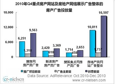 北京2011年5月4日電 /美通社亞洲/ -- CR-Nielsen(尼爾森互聯網研究)《2011年中國房地產網絡展示廣告市場研究項目報告》顯示,2011年中國房地產網絡展示廣告市場第一季度與去年同期相比呈增長態勢。2011年 Q1搜房網房產類網絡展示廣告投放量同比平穩增長。與去年同期相比,2011年 Q1搜房網房產廣告推廣項目數同比增長91.7%,增長較快。