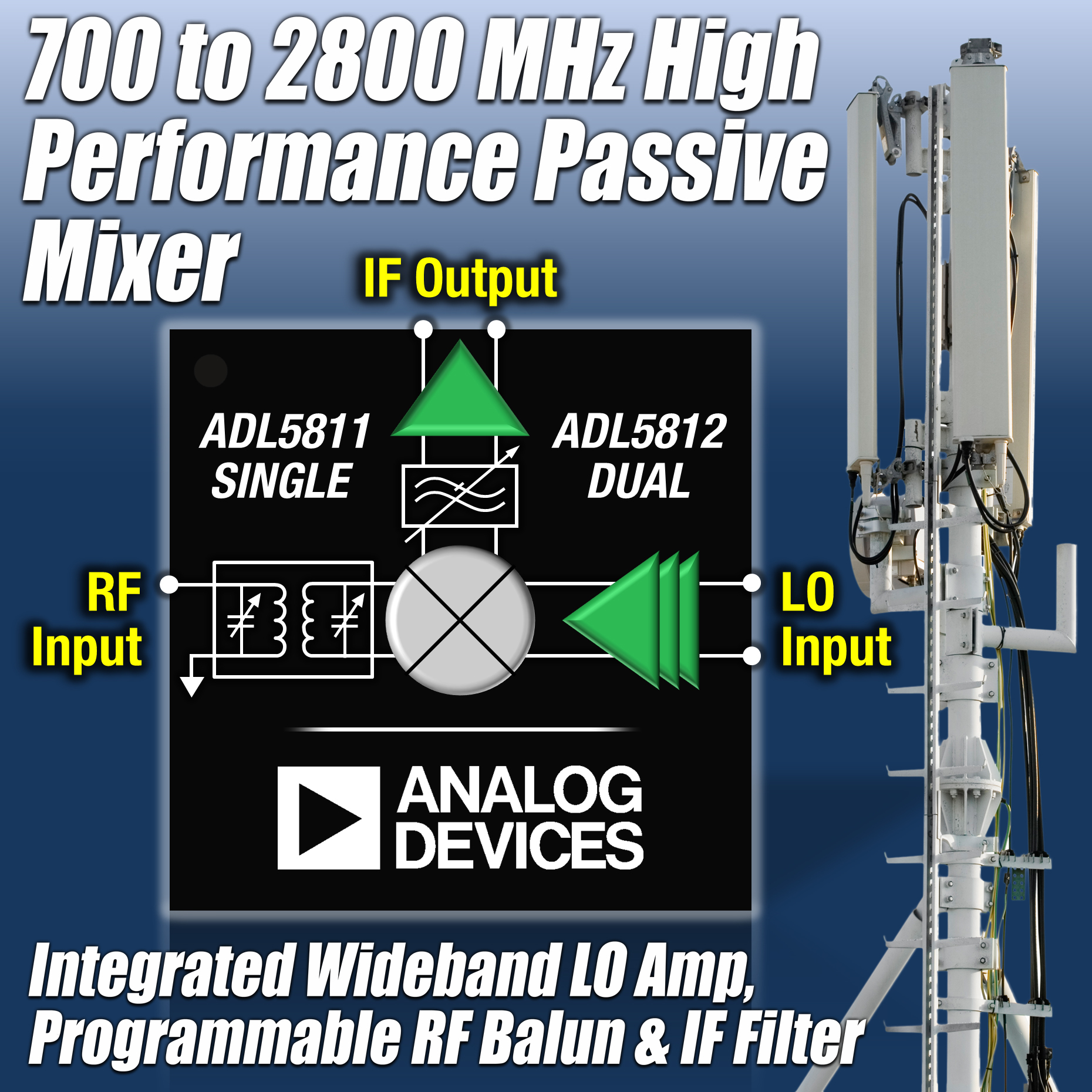 ADI 單通道和雙通道RF混頻器是業內首款集成寬帶LO放大器、可編程RF巴倫和IF濾波器以及IF放大器的產品,支持無線基礎設施和軟件定義無線電應用的寬帶工作模式。