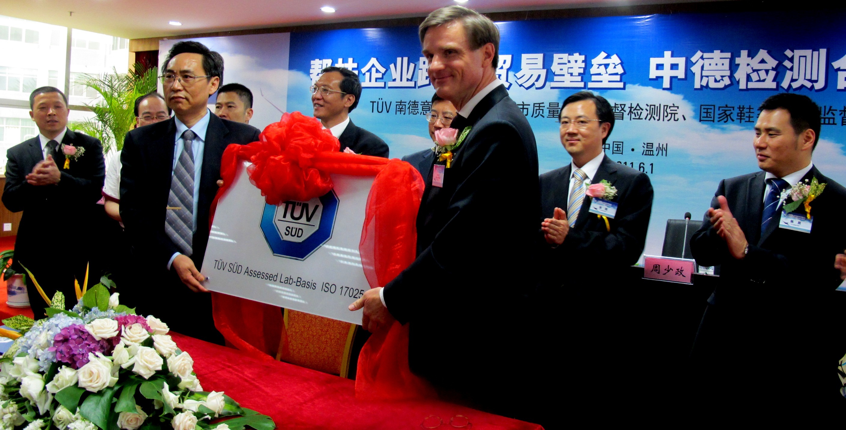 溫州2011年6月2日電 /美通社亞洲/ -- 2011年6月1日,溫州市質(zhì)檢院與TUV南德意志集團(tuán)在中國(guó)鞋都國(guó)家鞋檢中心大樓舉行了檢測(cè)合作簽約儀式。儀式由市質(zhì)監(jiān)局局長(zhǎng)吳一新主持。市委常委、副市長(zhǎng)周少政,TUV 南德意志大中華集團(tuán)首席執(zhí)行官&總裁范華德(Dirk von Wahl)出席了簽約儀式。市質(zhì)檢院院長(zhǎng)余建明和范華德總裁代表雙方簽署了合作文件,并向合作實(shí)驗(yàn)室授牌。