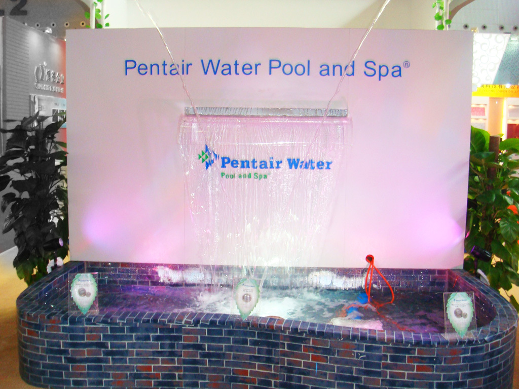 展會期間,流動的水景是濱特爾展位的一大亮點,兩米寬的水幕瀑布不間斷地營造出晶瑩剔透的水簾效果,在五彩繽紛的燈光襯托下顯得格外引人矚目。魔力光泉作為今年濱特爾泳池業務的新品,在展臺兩側向中心噴射出美麗的弧線。更令人驚訝的是,噴嘴噴出的拋物線就像一根玻璃管,沒有任何水花濺出,隨著 LED 燈不斷變化色彩,整個水景引起了專業人士及所有參觀者的興趣。