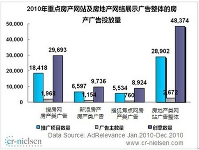 北京2011年8月10日電 /美通社亞洲/ -- CR-Nielsen(尼爾森互聯網研究)《2011年中國房地產網絡展示廣告市場研究項目報告》顯示, 2011年中國房地產網絡展示廣告市場第二季度呈持續增長態勢。2011年Q2房產類網絡展示廣告推廣項目數為14222,環比增長104.8%,同比增長98.1%;廣告主數為1742,環比增長30.2%,同比增長25.3%;創意數為20324,環比增長100.2%,同比增長68.6%。其中,搜房網的各項指標遙遙領先,占據行業第一。