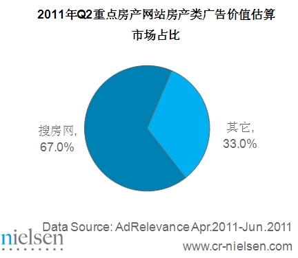 2011年Q2房產類網絡展示廣告價值估算整體達到3.01億元,其中搜房網房產類廣告價值估算高達2.02億元,占行業整體的67.0%,遠超其他競爭對手。