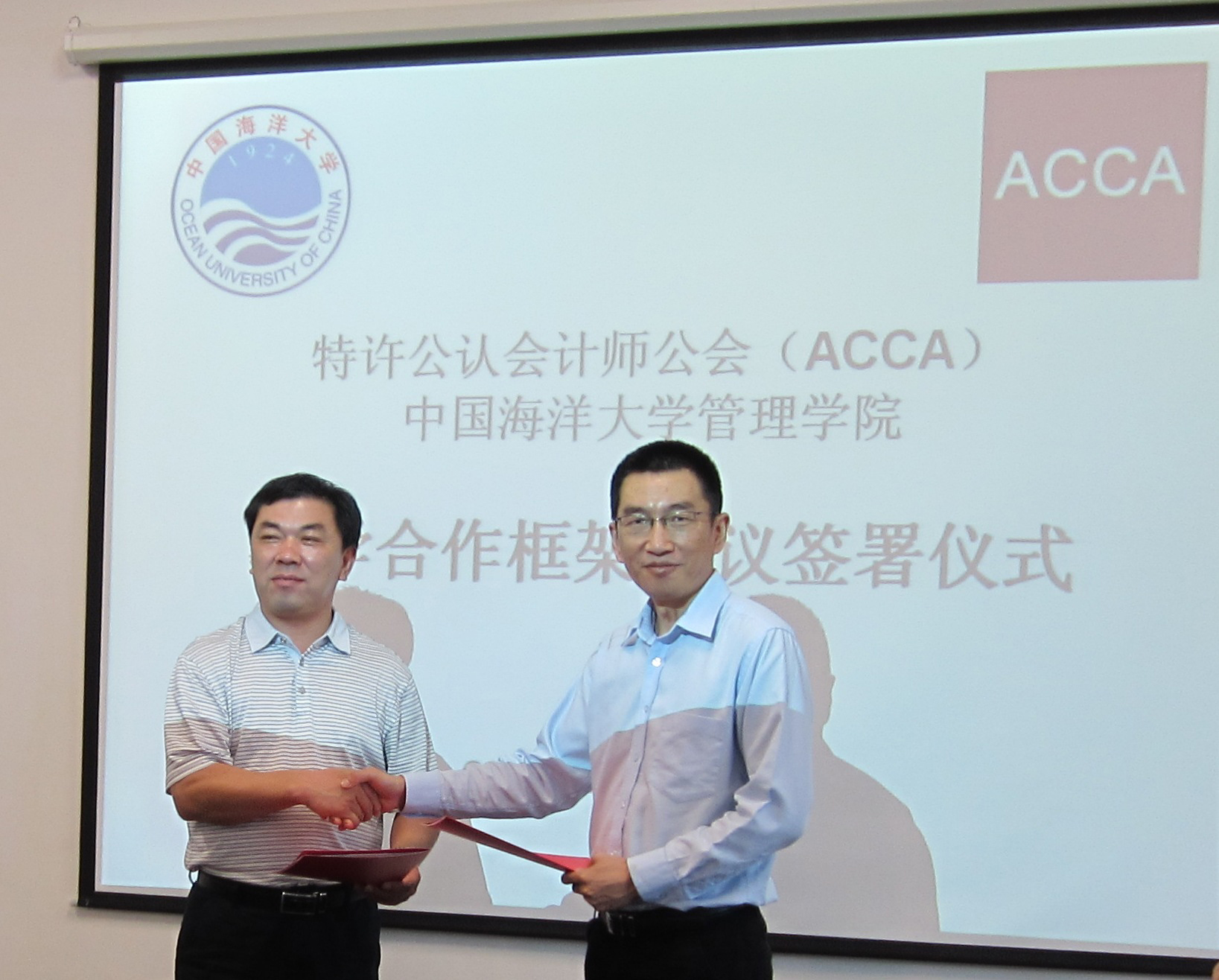 中國海洋大學管理學院教學合作框架協議”簽署儀式在中國海洋大學管理學院隆重舉行。ACCA 北京代表處首席代表于翔天先生與管理學院院長權錫鑒教授、副院長兼會計學系主任王竹泉教授等進行了親切的會談并簽署了正式合作協議。根據協議,管理學院將 ACCA 國際財會資格課程嵌入到會計學專業本科教學中,計劃于2012年開始招收第一期 ACCA 方向班學員,培養緊缺的國際化高級財會人才。