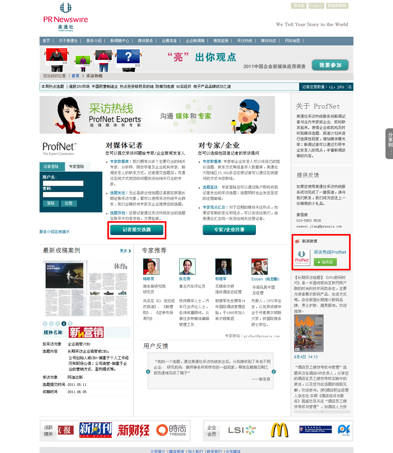 美通社中國(guó)區(qū)董事總經(jīng)理陳玉劼說:“美通社在2007年將在北美新聞界、公關(guān)界人盡皆知皆用的采訪熱線(ProfNet)平臺(tái)引入中國(guó),為中國(guó)的媒體與專家、企業(yè)搭建起一個(gè)快速溝通的橋梁,新版采訪熱線結(jié)合中國(guó)最流行的微博等社交媒體工具,充分發(fā)揮了采訪熱線的社交互動(dòng)優(yōu)勢(shì),為媒體和專家、企業(yè)新聞發(fā)言人提供更實(shí)時(shí)、便捷的溝通交流平臺(tái)。”