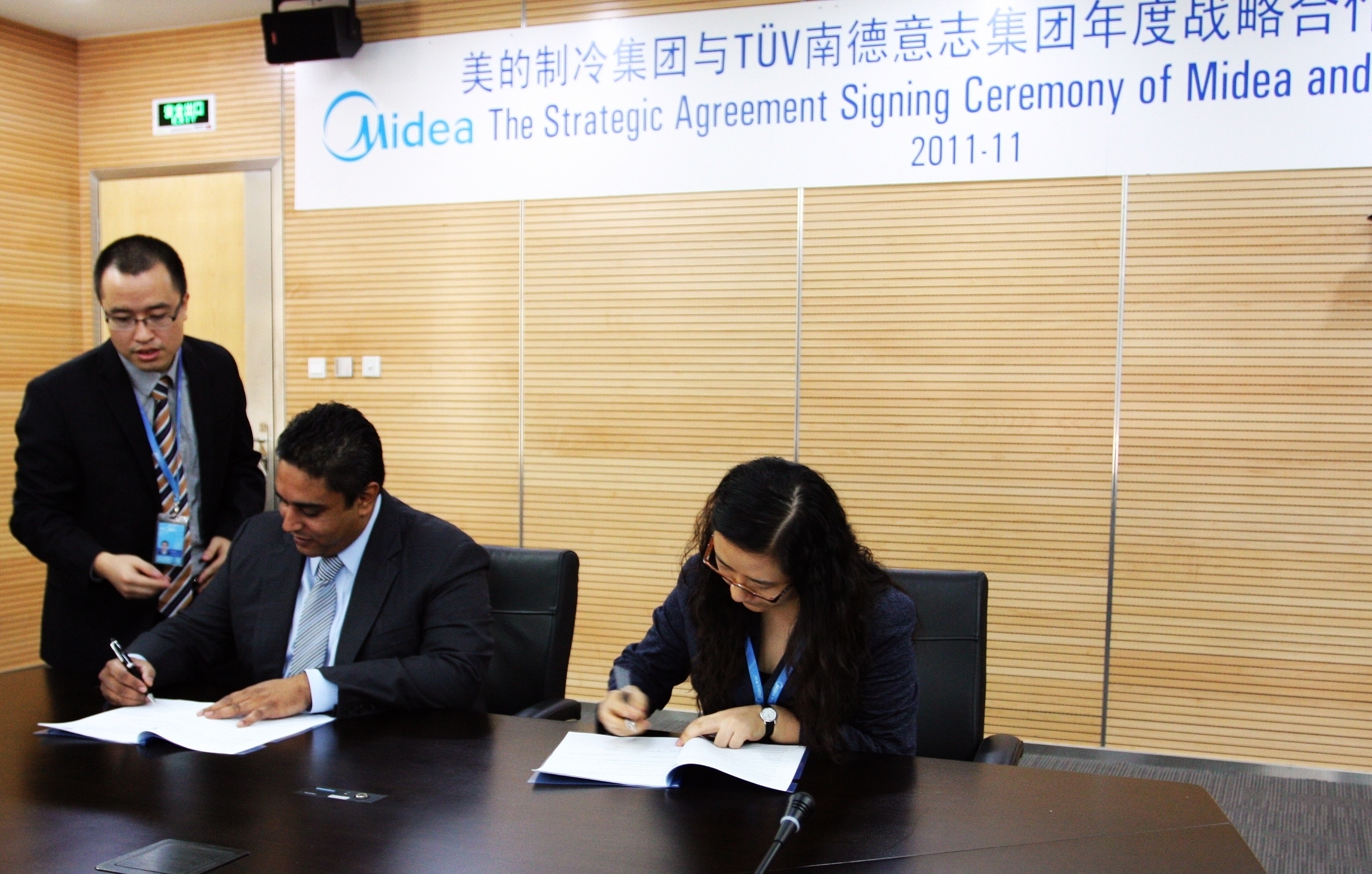 廣州2011年11月14日電 /美通社亞洲/ -- 2011年11月3日,TUV 南德意志集團(以下簡稱“TUV SUD”)全球產品服務部首席執行官 Ishan Palit 與美的集團國際事業部副總裁劉敏女士在順德北滘美的集團總部就雙方未來的合作模式達成戰略合作協議。這是繼去年九月份 TUV SUD 與美的集團簽署全方位戰略合作協議之后,雙方再一次深入合作。此次合作協議的成功簽署,進一步擴大雙方合作的領域,TUV SUD 將繼續致力于縮短美的產品的認證服務周期,加強海外產品監管,幫助美的產品在發達地區的商業滲透,拓展海外市場。