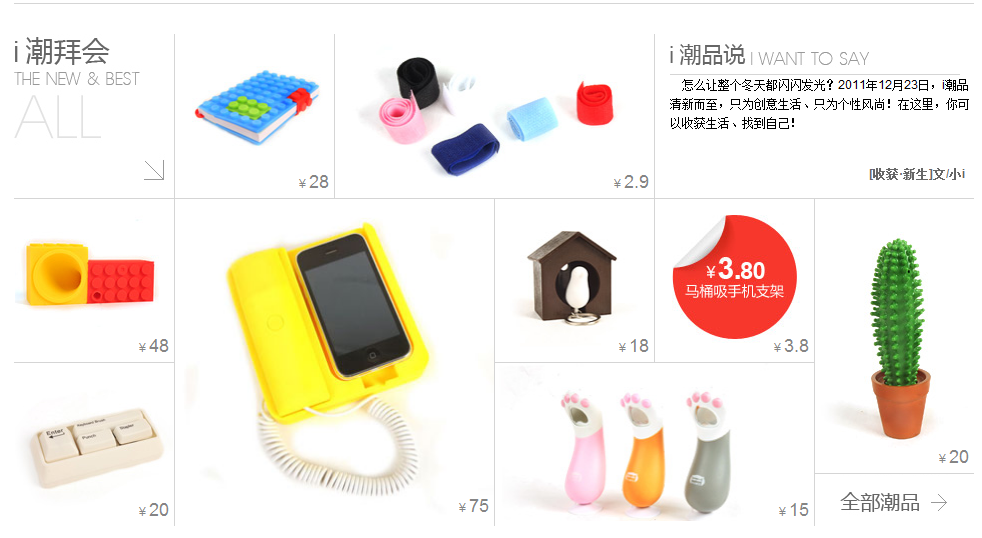北京2011年12月26日電 /美通社亞洲/ -- 誰說實(shí)用的東西一定不好看不好玩?中國領(lǐng)先的個(gè)性印品平臺(tái)網(wǎng)易印像派熱力推出全新創(chuàng)意雜物頻道 -- “I 潮品”(http://yxp.163.com/iwave/index/)。該頻道網(wǎng)羅全球各地最有意思的“創(chuàng)意潮流雜物”,為用戶打造一個(gè)包括生活、學(xué)習(xí)、搞怪和出行四個(gè)維度的趣味、實(shí)用、極具設(shè)計(jì)感的“小東西”購物平臺(tái)。“I 潮品”頻道是網(wǎng)易印像派“無設(shè)計(jì),不生活”品牌理念的進(jìn)一步詮釋,豐富了網(wǎng)易印像派消費(fèi)者的選擇。