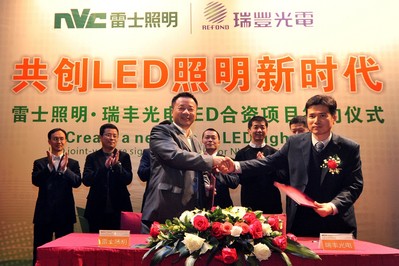 惠州2012年1月16日電 /美通社亞洲/ -- 2012年1月13日,中國照明行業(yè)龍頭企業(yè) -- 雷士照明(香港主板上市代號:2222.HK)與中國領(lǐng)先的LED封裝企業(yè) -- 瑞豐光電(全稱“深圳市瑞豐光電子股份有限公司”,股票代碼:300241.SZ)在廣東惠州舉行“共創(chuàng)LED照明新時代 -- 雷士照明·瑞豐光電LED合資項目簽約啟動儀式暨新聞發(fā)布會”活動,雙方強強聯(lián)合,優(yōu)勢互補,資源共享,開啟一個共贏 LED 照明新局面,全面推動行業(yè) LED 產(chǎn)業(yè)鏈升級與發(fā)展變革。