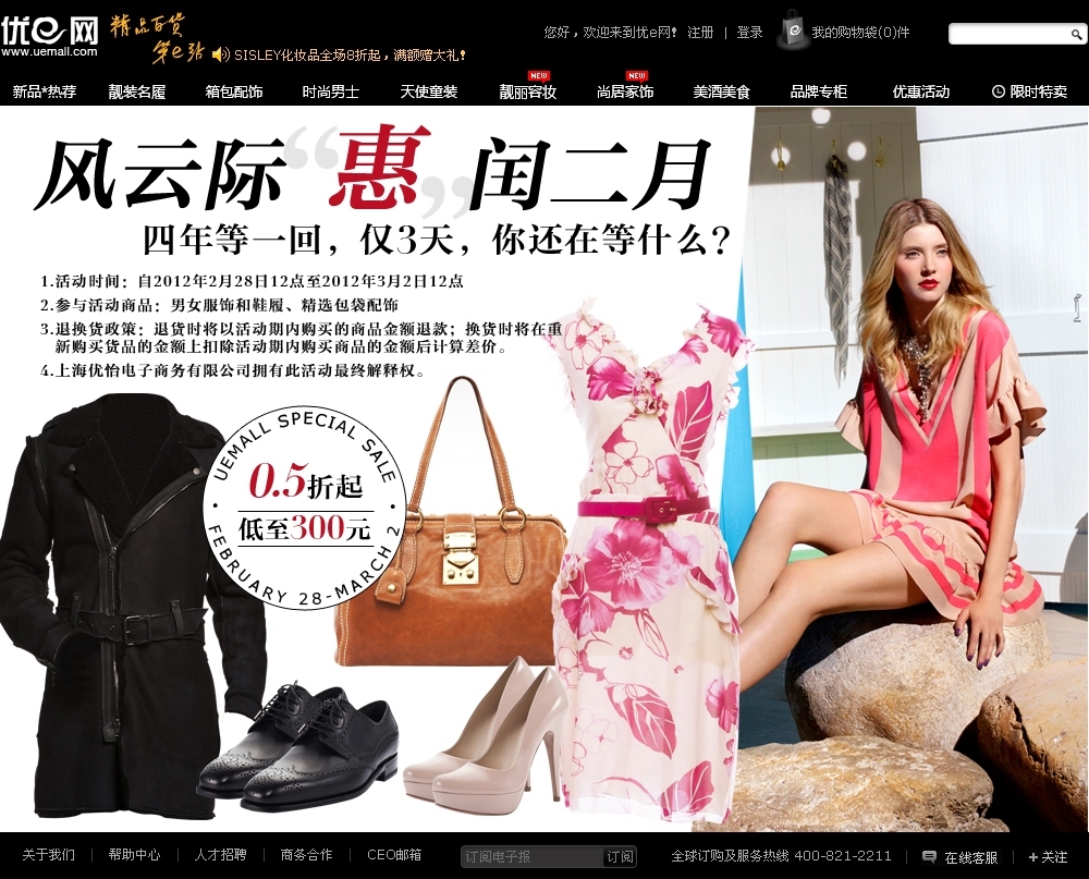 上海2012年2月28日電 /美通社亞洲/ --國內首家網上精品百貨商城優e網(www.uemall.com)將于2月28日至3月1日推出“風云際‘惠’閏二月”主題促銷活動。較低0.5折的勁爆折扣,為網購達人提供了添置時尚奢品的絕佳時機。
