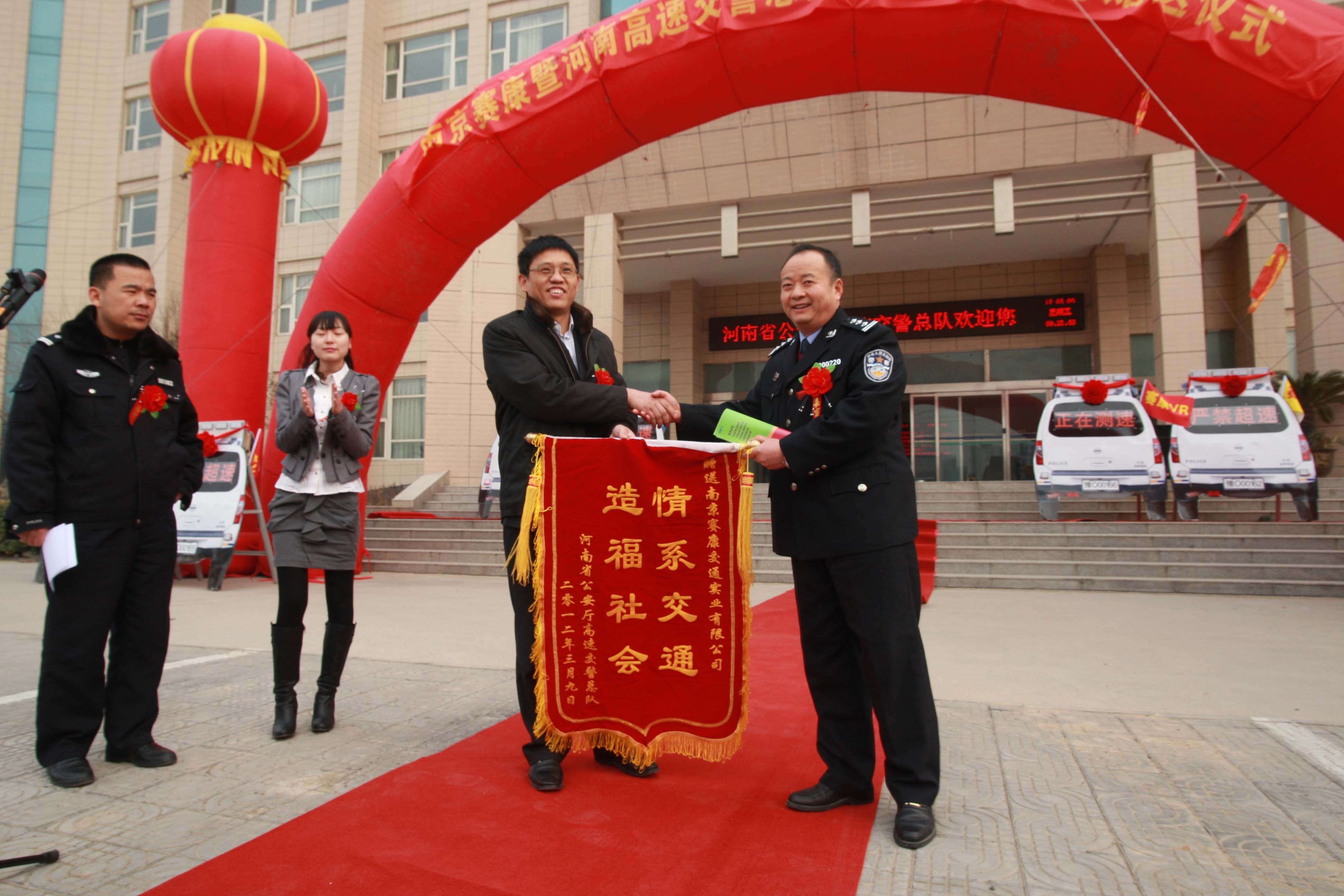 3月9日,河南省高速交警總隊接收了由南京賽康交通實業有限公司贈送的10輛每輛價值5000元的“仿真警車”。