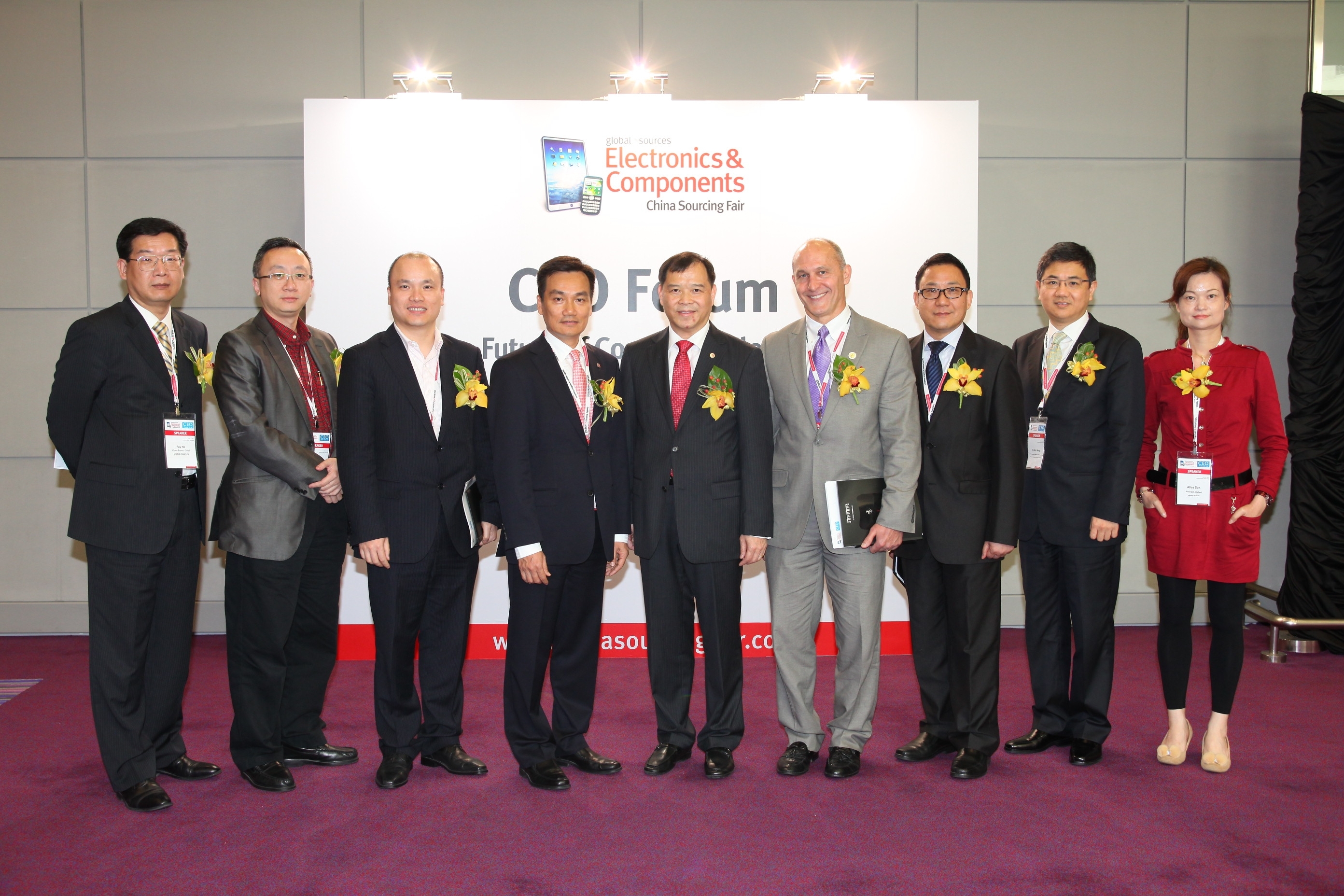 環(huán)球資源首席執(zhí)行官區(qū)乃光先生(左四)與出席“消費(fèi)類電子產(chǎn)業(yè)未來發(fā)展趨勢CEO高峰論壇”的行業(yè)頂尖專家合影,論壇今天在“環(huán)球資源電子產(chǎn)品及零件采購交易會(huì)”舉行。