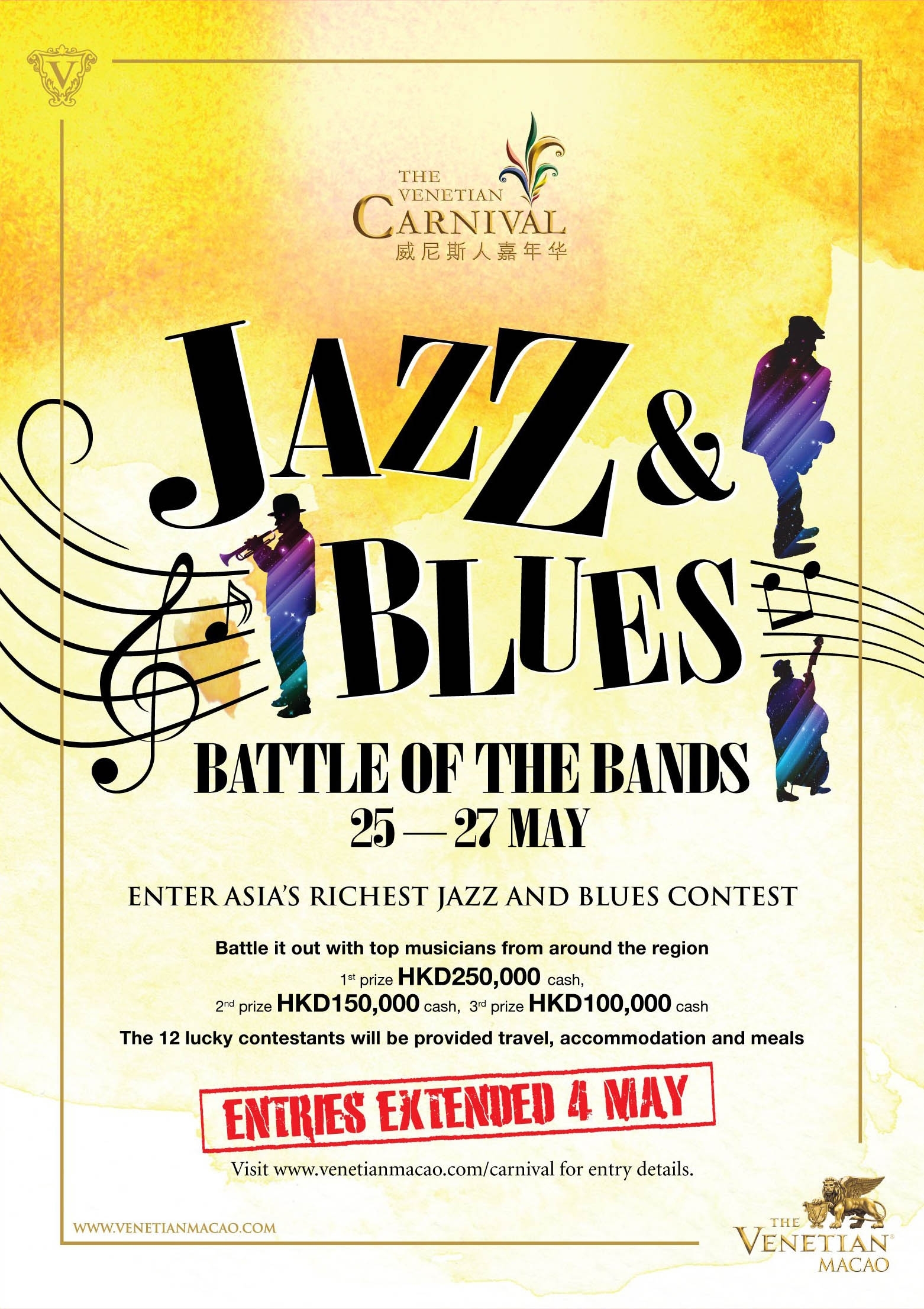 香港2012年4月26日電 /美通社亞洲/ -- 澳門威尼斯人®- 度假村 - 酒店“威尼斯人嘉年華”今年首次舉辦“爵士及藍調樂大比拼”,現已延長報名時間,讓更多音樂表演者能夠參加此次比賽。