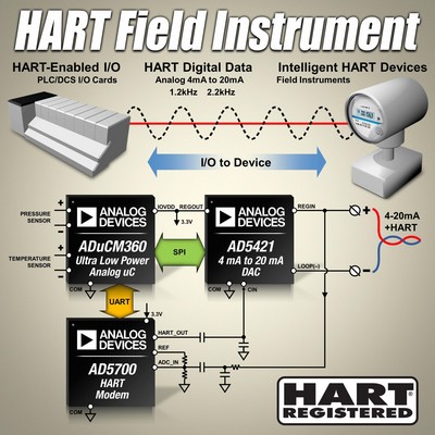配套產品包括ADI公司的HART調制解調器IC AD5700(用于HART通信協議編碼與解碼的單芯片設計),以及用于環路供電型智能發射器應用的16位DAC AD5421。