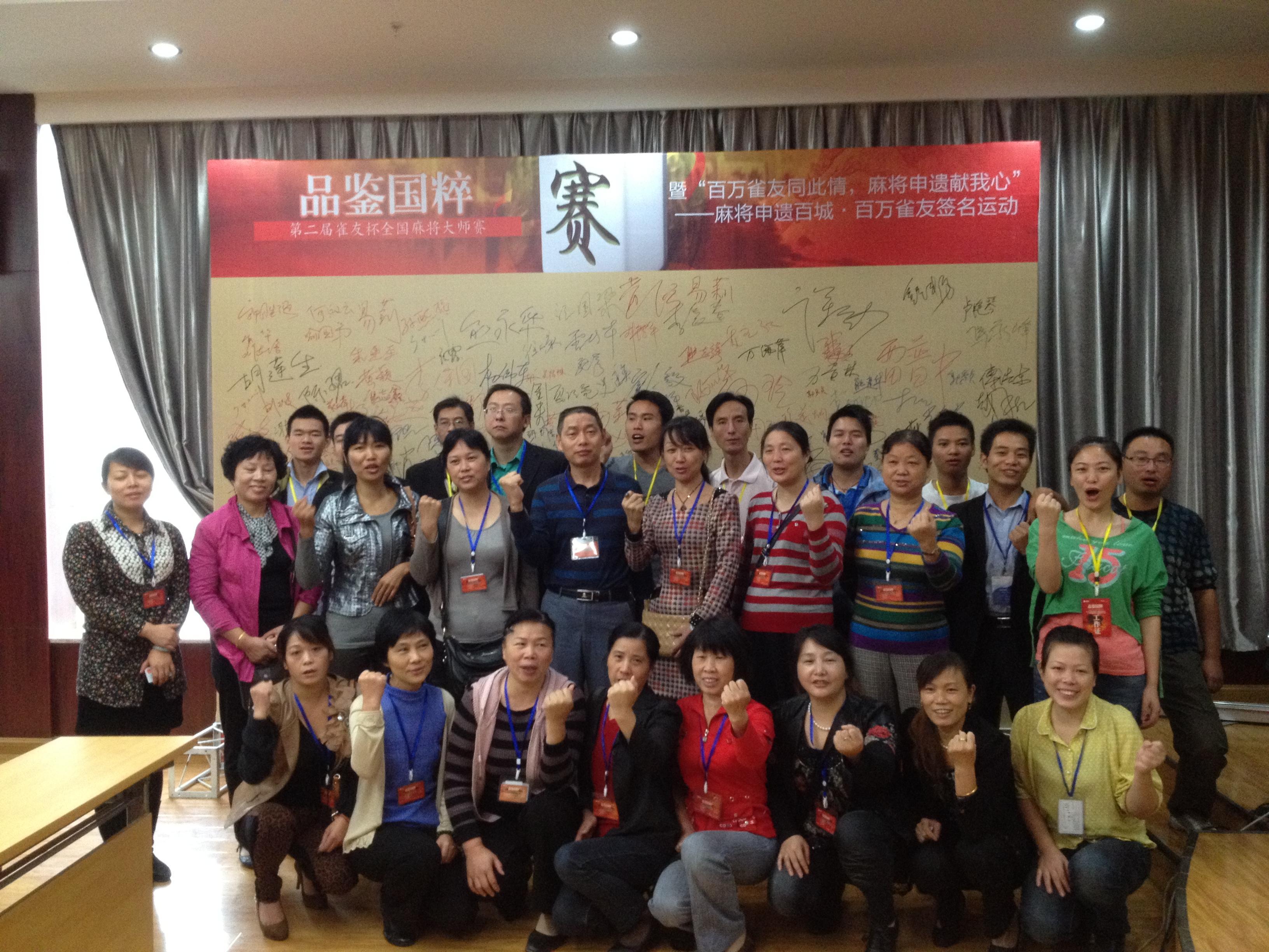 比賽開(kāi)始前,麻將愛(ài)好者紛紛在“百萬(wàn)雀友同此情,麻將申遺獻(xiàn)我心”申遺背景板上一一簽名,表達(dá)了對(duì)于傳統(tǒng)國(guó)粹 -- 麻將申遺的殷切期盼,而更多的麻友則以申遺為背景,忙著拍照、發(fā)微博留念。