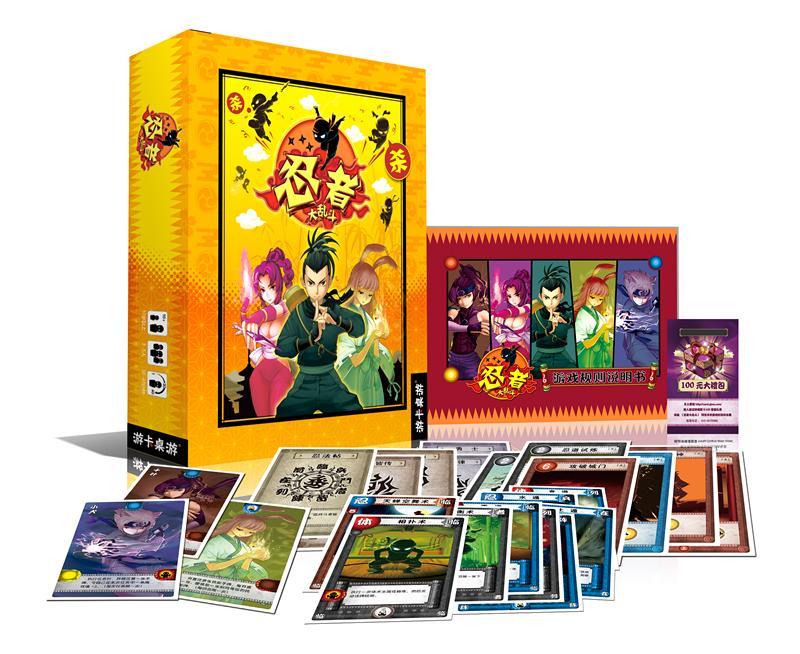 每盒《忍者大亂斗》,包含技能牌75張、任務牌24張、忍具牌18張、成就牌11張、人物牌5張、參考卡5張、共138張游戲牌,另附說明書1份、刮刮卡1張。卡牌畫工細膩,并采用高檔藍芯紙制作,零售價39元。