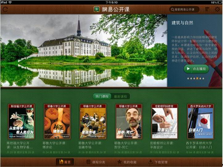 這次上線的新版,全新設計的界面使整個版面更加美觀,為用戶帶去簡潔舒爽的視覺感受;新增的課程篩選功能讓搜索更加便捷,在提升便利性的同時節省大量寶貴時間;下載、收藏頁面的附加功能讓課程管理清晰化成為可能,讓用戶在享受知識的同時感受有序性的使用體驗;為了讓每一位用戶在第一時間內了解到最新的課程,全新上線的網易公開課 iPad 版客戶端還增添了首頁刷新的功能,讓隨時隨地共享世界大師級先鋒思想成為可能。