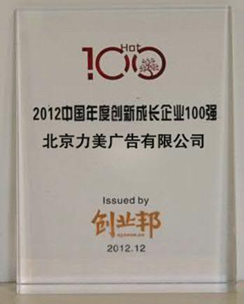 北京2012年12月10日電 /美通社/ -- 近日,由創(chuàng)業(yè)邦 (cyzone.cn) 主辦的“2012創(chuàng)業(yè)邦年會暨‘創(chuàng)業(yè)邦100’年度頒獎典禮”在北京千禧大酒店隆重舉行。本屆年會以“夢想照亮現(xiàn)實”為主題。經(jīng)過激烈的角逐與多方評估、審核,國內(nèi)領(lǐng)先的移動營銷解決方案提供商 -- 力美廣告?zhèn)髅?/a>,憑借其創(chuàng)新且領(lǐng)先的綜合實力,喜獲“創(chuàng)新成長企業(yè)100強”稱號。