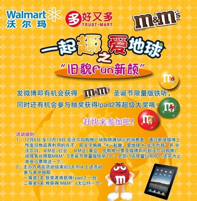 即日起至2月9日,全國范圍的沃爾瑪購物廣場、好又多門店還攜手可口可樂,邀顧客“新年抽大獎(jiǎng),iPad mini拿回家”。凡在任一沃爾瑪、好又多門店購物滿一定金額,且采購的商品包括可口可樂任意產(chǎn)品,即可參與抽獎(jiǎng)。每店設(shè)一名特別獎(jiǎng),將獲得WLAN機(jī)型16GB iPad mini一臺(tái);10名幸運(yùn)獎(jiǎng),將獲得可口可樂汽水一箱(330毫升24罐裝)。各門店將于2月17日進(jìn)行抽獎(jiǎng)活動(dòng),并與獲獎(jiǎng)?lì)櫩吐?lián)系(詳情請(qǐng)咨詢店內(nèi)服務(wù)臺(tái))。