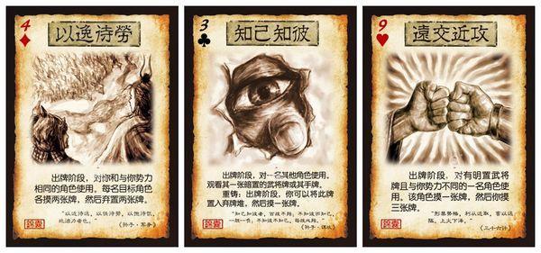 知己知彼可以理解為兩張錦囊,因為它具有完全不同的兩種效果:觀看對方武將,這是一個掌握時機動向的關鍵牌張,一般會推薦從身邊的人看起,這樣對于自己后續(xù)的操作比較有幫助,或者去窺探一直在隱忍的角色也是個不錯的選擇,畢竟他可能是個不定時的“炸彈”。觀看對方手牌,這可以說是開創(chuàng)了三國殺游戲的一個新的概念,畢竟之前只有火攻能夠做到讓別人展示手牌的效果,而且還是對方讓你看什么你就只能看什么,不論是出于進攻或者防御的目的,都是個不錯的選擇。