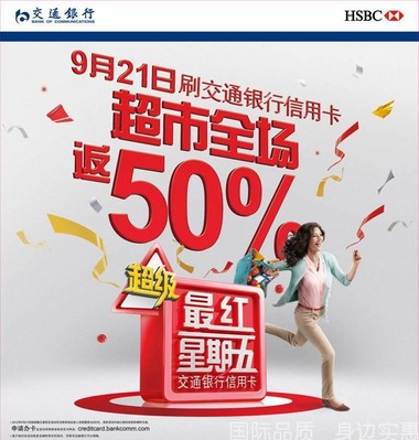 除了辦卡實惠外,交通銀行信用卡的眾多優惠活動也頗為引人眼球,其首創的“最紅星期五”營銷品牌系列,如每周五在超市和加油站消費滿額可獲5%刷卡金獎勵、滿足一定消費金額可10元看電影等;2013年還將延伸至美食、商旅等消費領域。精選優惠商戶讓持卡人享受到折扣優惠或是專屬精美禮品,每次刷卡都能有意外收獲。而長期積分積累活動“倍多分”、境外消費單筆刷滿1000元享該筆消費10倍積分等活動讓持卡人的積分迅速累計,還有在肯德基、必勝客、哈根達斯等商戶“用積分兌換美食”活動,業內首創“積分當錢花”的積分樂園商城更是全場積分通用,為持卡人提供了積分消費的多重渠道。
