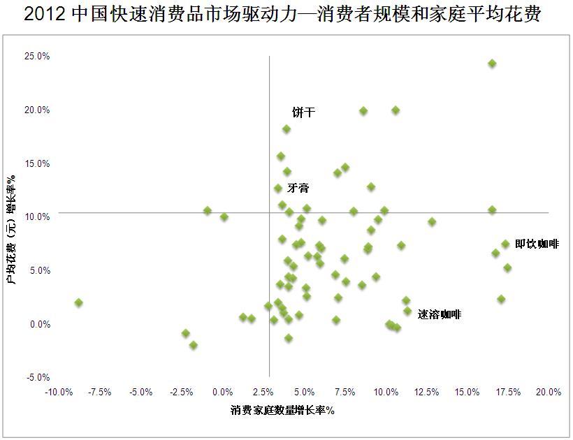 大多數(shù)的快消品品類必須同時依靠提升消費者規(guī)模和花費水平來實現(xiàn)市場增長,受益于中國城市化進(jìn)程和市場的發(fā)展,2012年90%的快速消費品品類的購買家庭數(shù)量有明顯增長,品類中的領(lǐng)先品牌更是在競爭消費人群中得到更大的收益。
