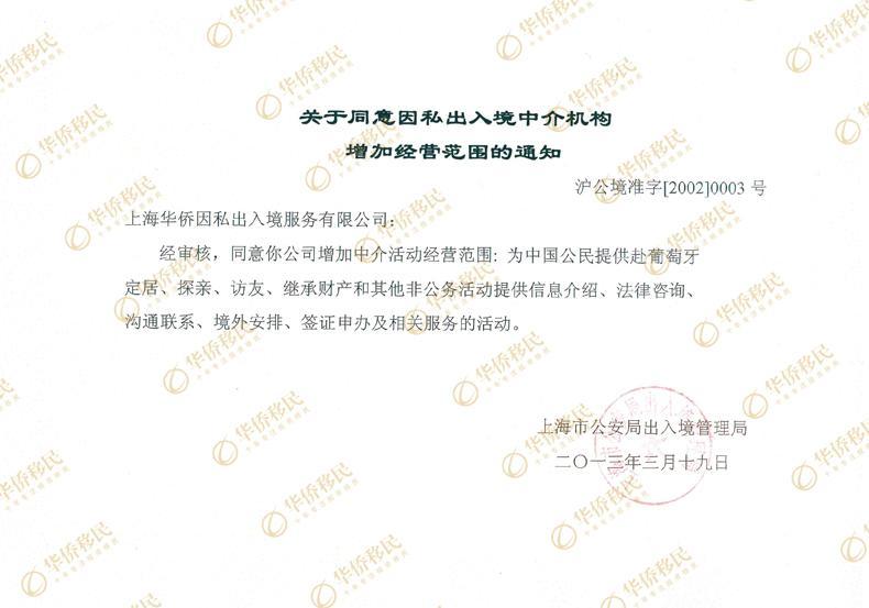 2012年年底,華僑移民正式地向相關部門提出申請,批文的重點就是增加新出臺的葡萄牙移民項目經營。上海市公安局出入境管理局受理并對華僑移民做了嚴格的考核。華僑移民的企業資質,華僑移民葡萄牙境外合作機構、葡方項目方資質、資格、品質等等都是考核的重要內容。
