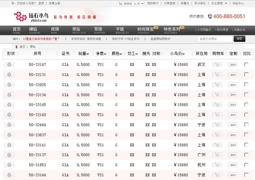 上海匯金百貨的一家珠寶品牌店的負責也印證這一說法,她舉了一個例子:一顆“50分的G色 VS1,3EX”的成品鉆石女戒,3年前,可以輕松賣到2.5萬左右,后來專柜品牌之間的競爭加劇,也就不得不打折賣到2.2萬,即便是這樣還要經受不住電商的沖擊,她就親自上鉆石小鳥的官網查詢過,同樣的一顆裸鉆,鉆石小鳥只賣1.6萬不到,記者通過查詢鉆石小鳥的官網印證了這一說法。