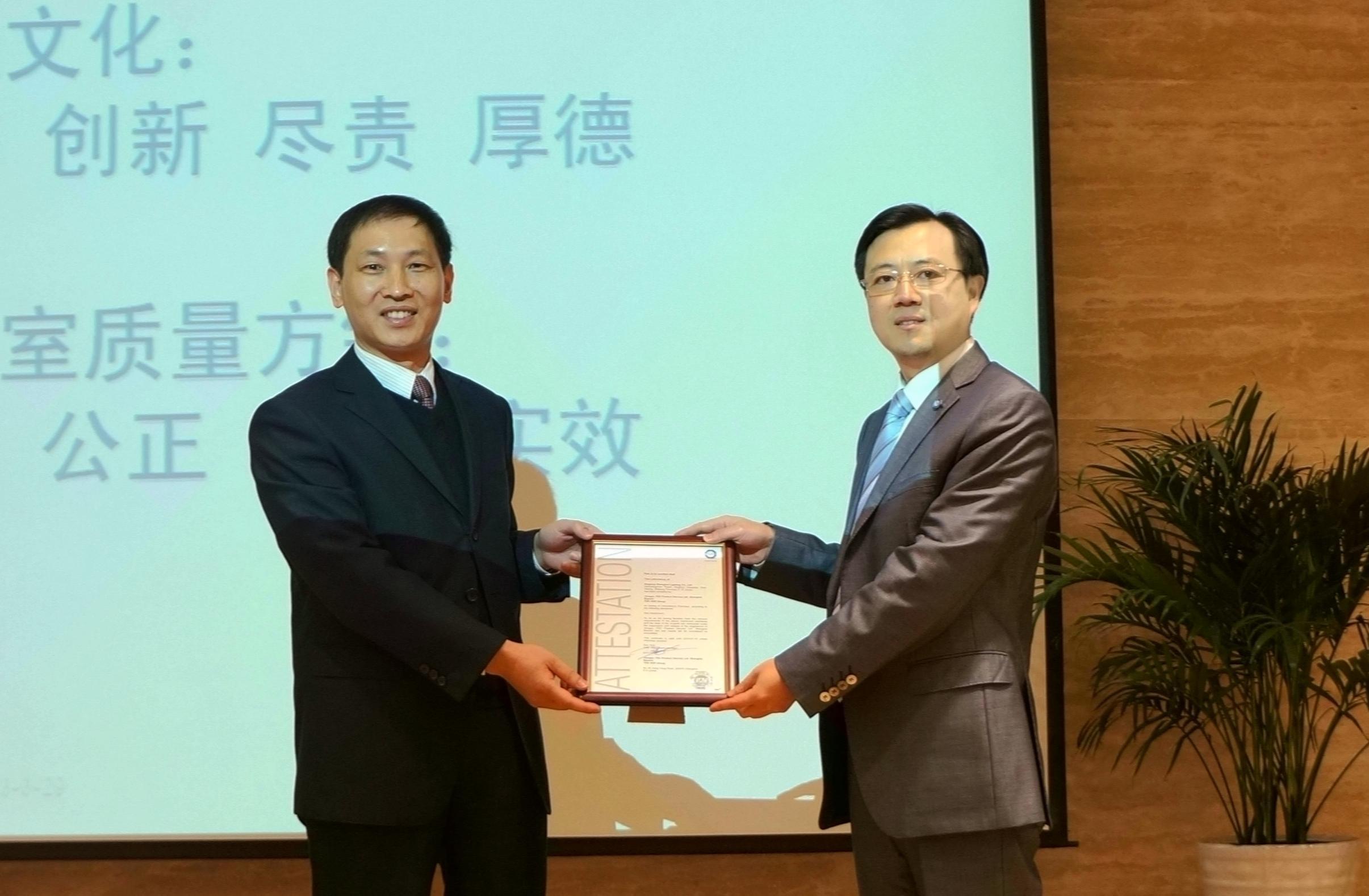 嘉興2012年4月1日電 /美通社/ -- 2013年3月29日,TUV 南德意志集團(以下簡稱“TUV SUD”)為浙江生輝照明有限公司頒發了LED光源合作實驗室授權證書,使其成為長三角地區首個獲得TUV SUD此類證書的照明企業實驗室。經過1年多的時間,生輝照明通過了TUV SUD嚴苛的審核,終于獲得此項證書,證明生輝照明在設備計量、流程規范、人員培訓、環境控制、數據對比、文件完善、數據記錄與管理等各個方面符合測量體系要求。TUV南德意志大中華集團高級副總裁 & 中區董事總經理金燦先生向浙江生輝照明有限公司常務副總經理陸光明先生頒發了證書。從2006年至今,TUV SUD已經為生輝照明頒發了數百張證書。