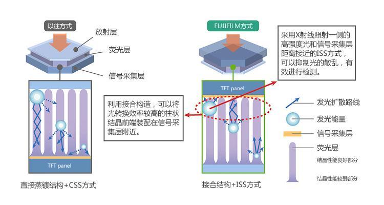 用于一般間接變化型FPD的CSS(Conventional Side Sampling,即傳統(tǒng)的透過側(cè)采集)方式中,X射線照射部位設(shè)置熒光層,發(fā)射部位設(shè)置信號采集層 (TFT panel)。CSS方式下,X射線發(fā)射部位發(fā)出的高強度光在到達信號采集層的過程中,容易發(fā)生衰減和散亂,使X射線信息損失較大。另一方面,在富士膠片獨有的“ISS技術(shù)”中,在X射線照射部位設(shè)置信號采集層,縮短了X射線在到達信號采集層之前經(jīng)過的的距離,從而可以有效接收X射線檢測出發(fā)出的光。此外,沒有采用將CsI柱狀結(jié)晶之直接蒸鍍于信號采集層,形成CsI柱狀結(jié)晶的一般“直接蒸鍍結(jié)構(gòu)”,而是采用了光轉(zhuǎn)換效率高,結(jié)晶性能優(yōu)越的CsI柱狀結(jié)晶先頭部分和信號采集層貼合的“接合結(jié)構(gòu)”,從而使高畫質(zhì)化成為可能。(請參考圖1)
