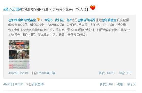 目前,傲游向四川災(zāi)區(qū)捐贈救災(zāi)物資的工作正在緊張開展。委托@加措活佛-慈愛基金 向災(zāi)區(qū)捐贈了帳篷1000頂,睡袋300個,方便面300箱,創(chuàng)可貼300包,以及若干毯子、雨衣、女性用品、手電筒、幼兒用品等災(zāi)區(qū)急需物資。并且在物資采購到位后,傲游還派出一名專業(yè)的傲游志愿者深入災(zāi)區(qū),協(xié)助基金會進(jìn)行救助活動,一同保障物資能以較快速度送達(dá)災(zāi)區(qū)。在災(zāi)難面前,傲游用切實(shí)的行動展現(xiàn)了互聯(lián)網(wǎng)企業(yè)在危難時刻的擔(dān)當(dāng)。