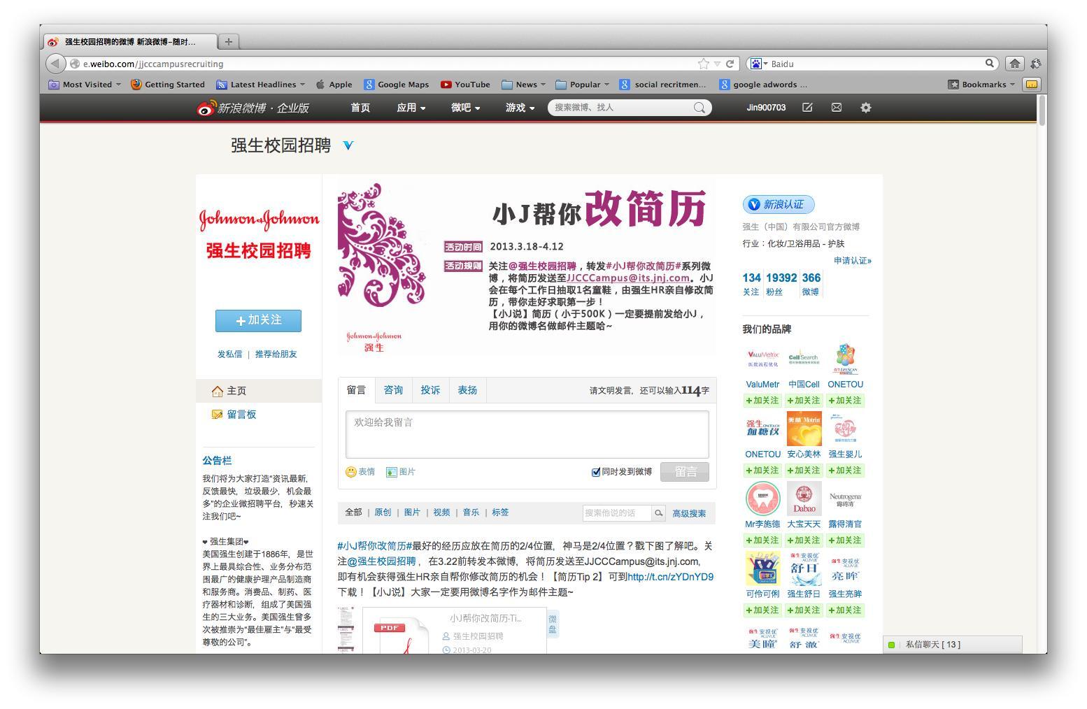 毋庸置疑,對于企業而言,為了使社交媒體賬戶擁有更大訪問量,舉辦活動始終是一種非常好的方法。然而 ,我們卻見許多企業將原本應以“分享與評論”為主題的活動變為“關注并抽獎”的形式。盡管后者也能達到品牌推廣的目的,但是與前者相比,這種互動方式常常只能產生較低的參與率。最近,強生集團在其新浪微博校園招聘賬戶上發起了一項名為“小J幫你改簡歷”的活動。在參與活動的過程中,學生們可以將個人簡歷發給強生集團并且對相關活動內容進行評論和轉發。每一天,強生集團人力資源部會選出一份簡歷對其進行修改,并將修改樣本發布在其微博平臺供學生們下載、參考。這個活動的亮點部分,是使粉絲有機會獲得專業意見,并且從中獲益,從而不僅確保了參與率,同時提高了雇主品牌影響力。