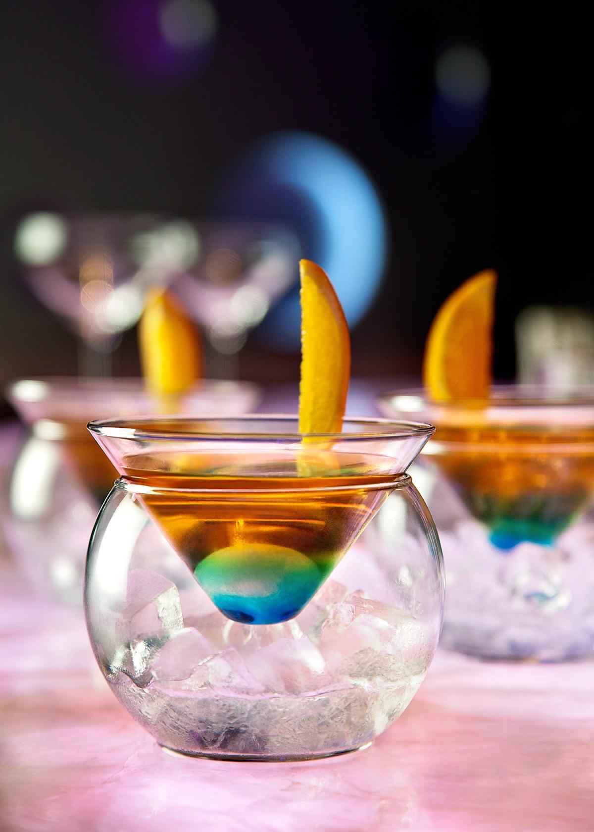 麗笙托帕雞尾酒的創作靈感則來自黃玉,它不僅色澤綺麗、引人遐思,而且價值不菲。這款雞尾酒由無酒精的藍橙 (Blue Curacao)、純糖漿、鮮榨青檸汁和薄荷葉調配而成,配上糖球一起飲用。