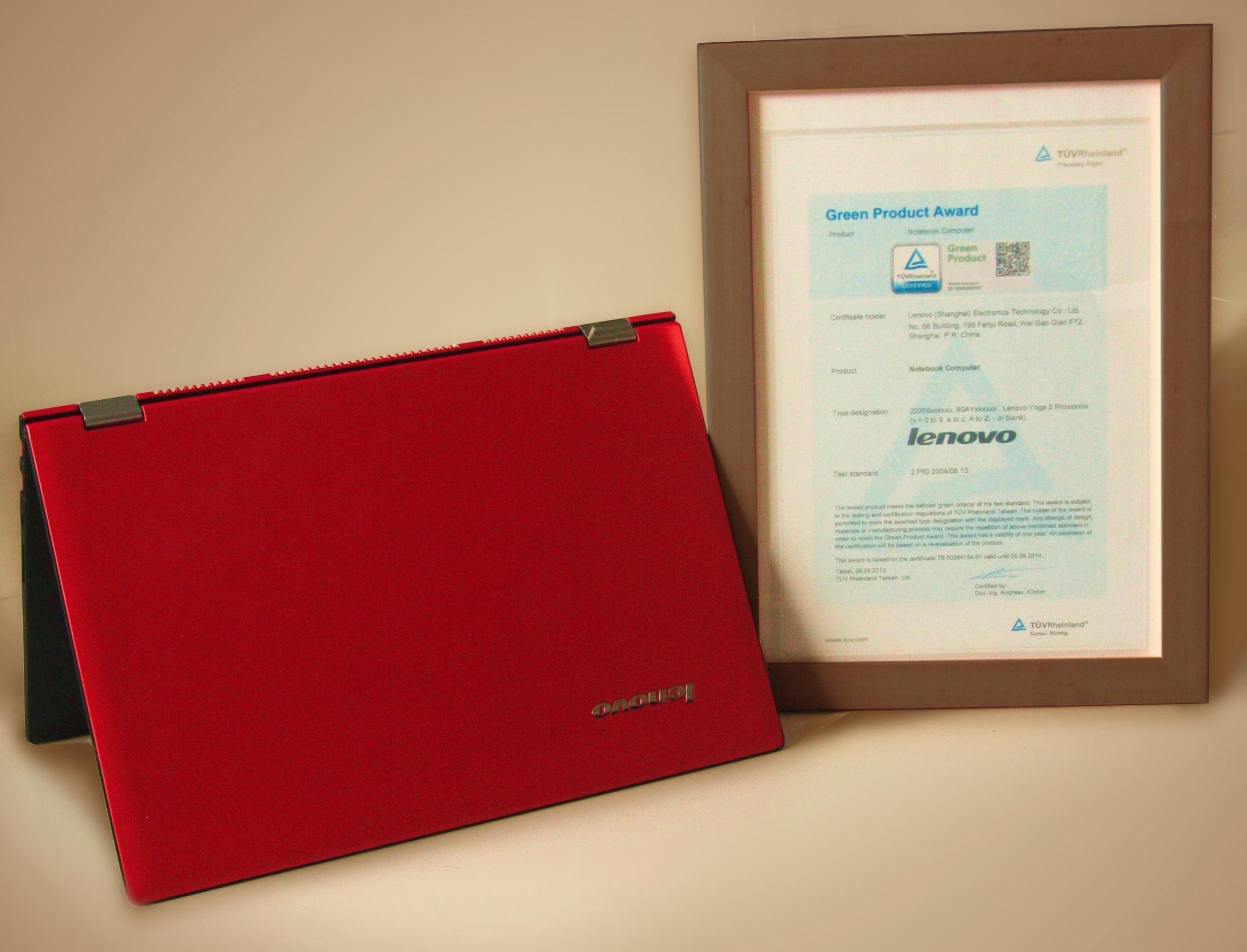 上海2013年10月8日電 /美通社/ -- 2013年9月25日,聯想Yoga 2 Pro筆記本在全球隆重上市。作為廣受業界及用戶好評的Yoga超級本第二代,Yoga 2是2013、2014年聯想集團主推的明星款筆記本,而這款型號除了專業的優異性能之外,更帶上了德國萊茵TUV的綠色產品標志,是目前國內為數不多的綠色產品認證筆記本,并且是德國萊茵TUV頒出的首例筆記本綠色產品認證。9月26日,德國萊茵TUV上海首席運營官陸勛海、德國萊茵TUV大中華區電子電器產品服務銷售總經理都江等于聯想上海的研發中心向聯想筆記本研發高級總監袁康頒出了這首例證書。