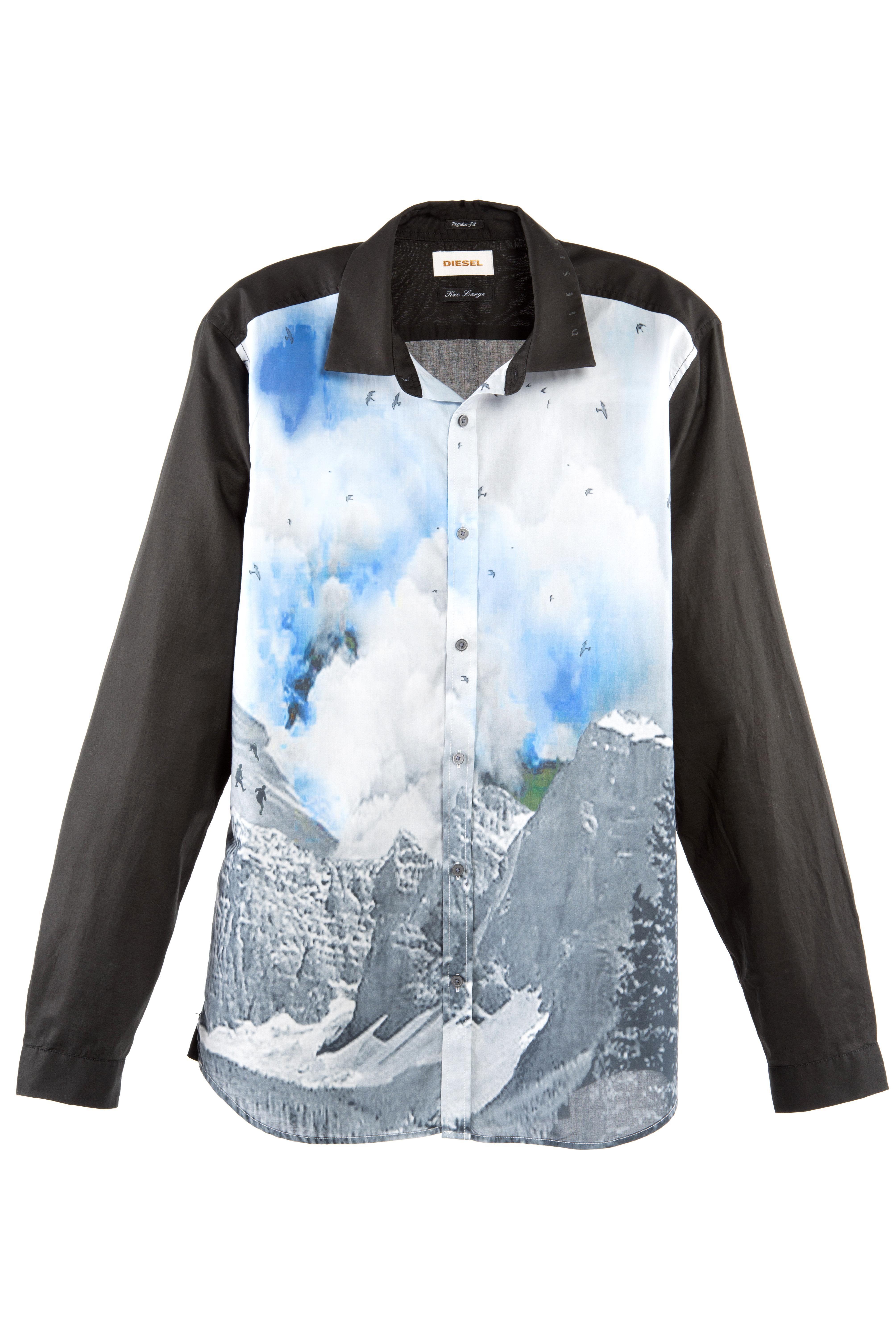 此款印花襯衫的靈感來自于迷彩。設計師采用特殊工藝將該系列襯衫處理成為移動的畫布,用照片和圖案在上面描繪出洛杉磯市郊的生活 -- 黑色作為主基調與藍紫色的煙云印花形成強烈對比,有如點綴在夜空中的閃亮繁星,大膽的圖案運用與吞噬等處理手法無不體現搖滾精神,彰顯DIESEL不羈自我的品牌精神。