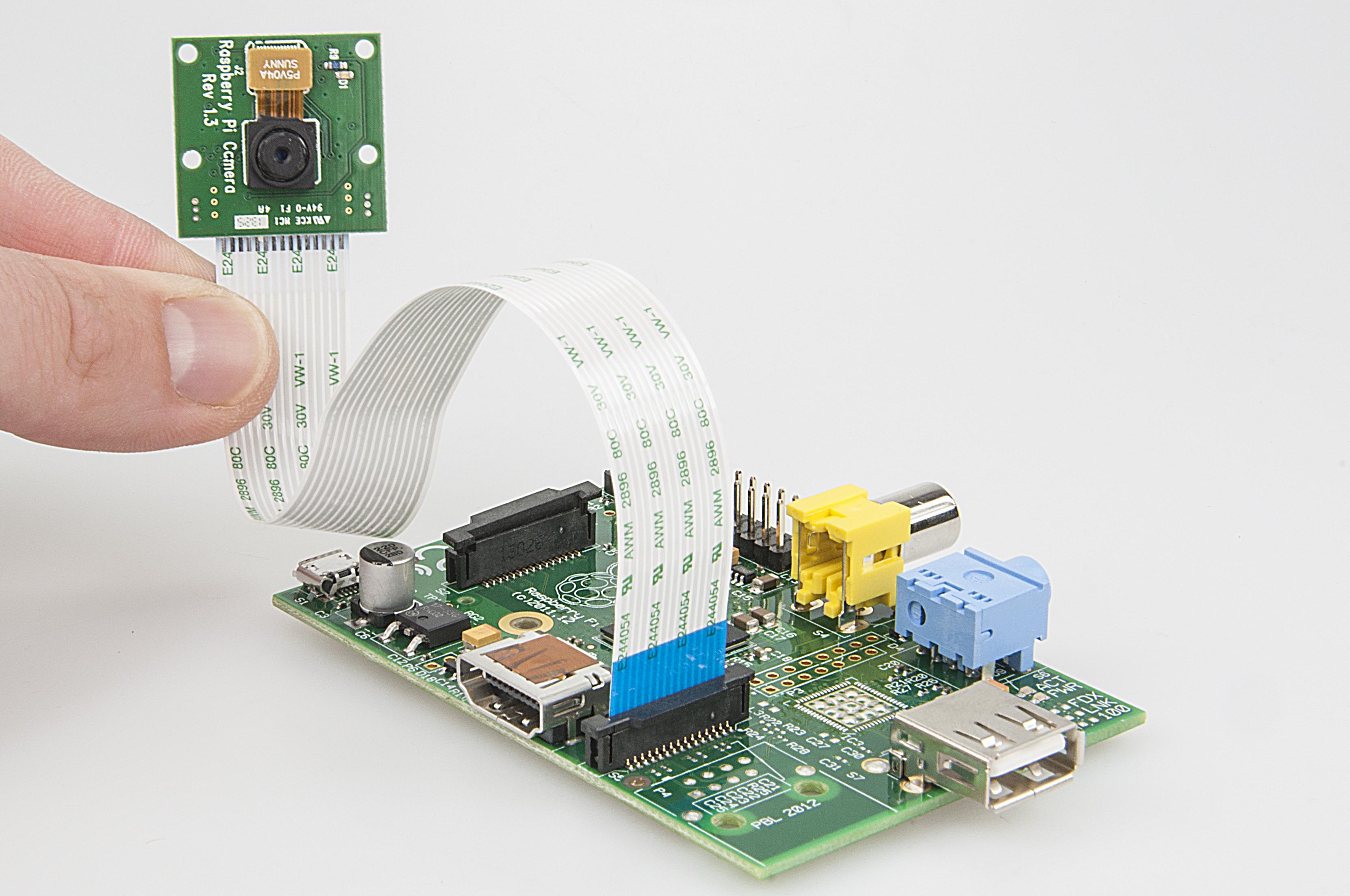 樹(shù)莓派A型板為矮版,信用卡大小,含256MB RAM、一個(gè)USB端口,無(wú)以太網(wǎng)連接。相機(jī)模塊僅有25mm x 20mm x 9mm大小,重量略大于3克,包含一個(gè)500萬(wàn)像素CMOS傳感器,能夠拍攝2592 x 1944像素的靜態(tài)圖像,同時(shí)支持1080p(30fps)、720p(60fps)和640x480p(60或90fps)視頻拍攝。相機(jī)模塊通過(guò)一條短排線連接到樹(shù)莓派A型板,并采用CSI和I2C進(jìn)行控制。