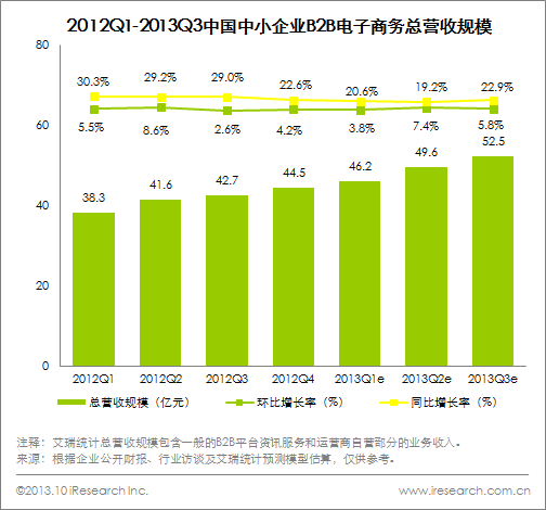 艾瑞咨詢統計數據顯示,2013Q3中國中小企業B2B電子商務市場營收達52.5億元,同比增速提升,達22.9%,環比增長5.8%。整體而言,中小企業B2B電子商務市場持續回暖,穩步發展。